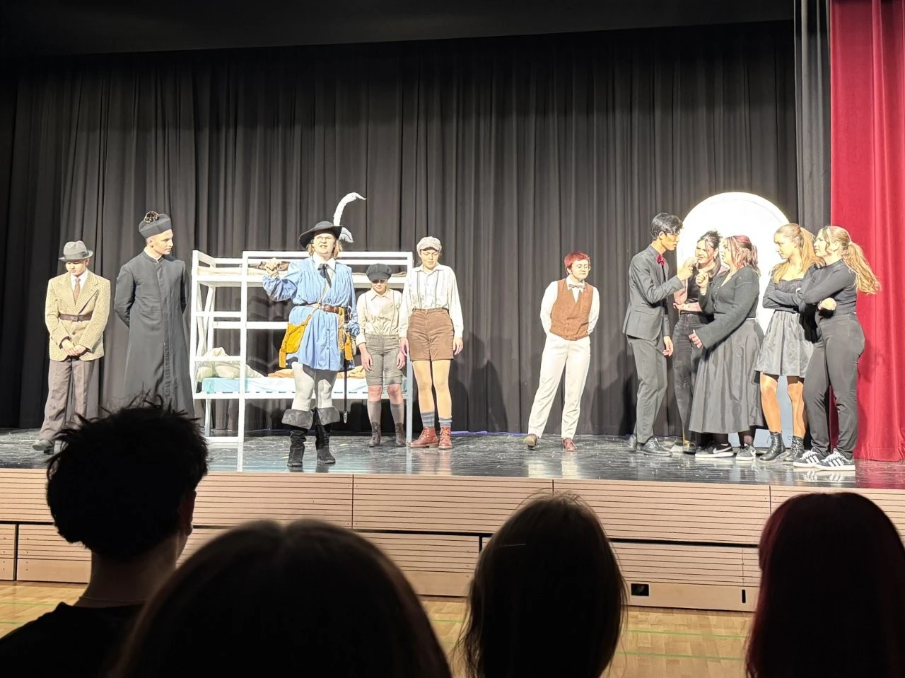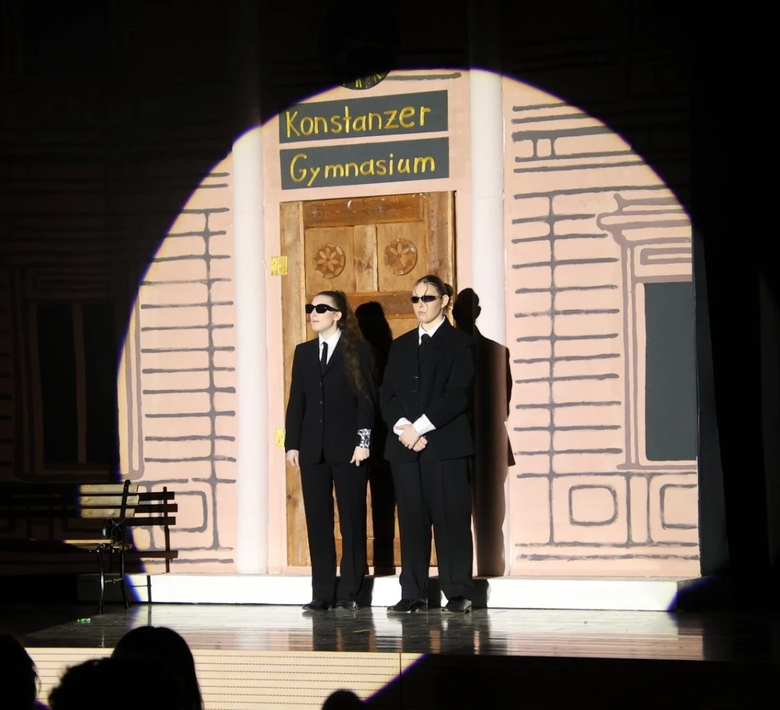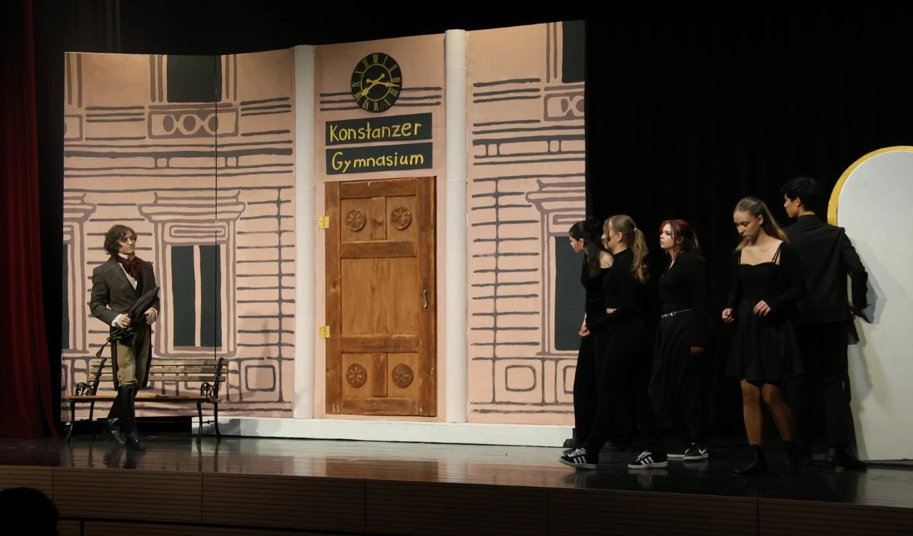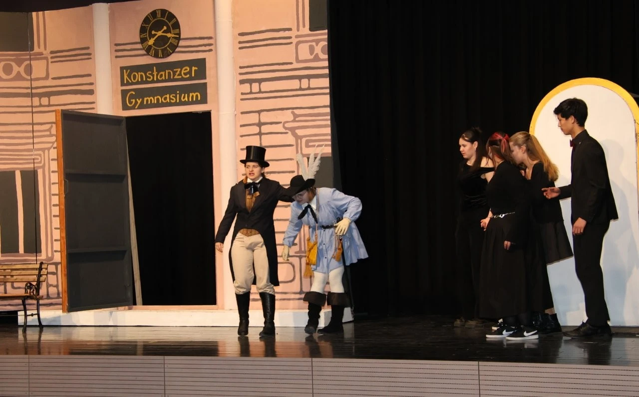 Der erste Quantensprung katapultierte die Zeitreisenden Clara (Rosa Straub), Jenna (Medea Wäldele), Max (Janik Wang), Anni (Charlotte Schmid) und Toni (Sophie Jarosch) ausgerechnet vor eine Schule in Konstanz. Doch, oh Schreck, just in diesem Moment wurde ein junger Bursche mit einem Heckerhut auf dem Kopf und einem Säbel in der Hand aus dem Gymnasium geworfen. „Ihr seid auch Revolutionäre! Schließt Euch mir an!“ rief der junge Revolutionär, fuchtelte mit seinem Säbel herum und outete sich als ein revolutionärer Hitzkopf, der nach der gescheiterten Revolution von 1848 in die Schweiz fliehen musste. Im faszinierenden Spiel entlang der Zeitlinie gelang es Adrian Keller auf faszinierende Weise, die Persönlichkeit Franz Xaver Lender und die Schulgeschichte so zu präsentieren, dass historische Fakten, humorvolle Elemente und ausdrucksstarkes Spiel der Akteure sich zu einem perfekten kulturellen Jubiläumsgeschenk formten. Daran hatte das Orchester des Musikprofils 9 (Leitung Ellen Krämer) einen klangschönen Anteil, denn die Zeitetappen wurden variantenreich mit jazzigem Sound, festlichem „Pomp and Circumstance“ und futuristischen Star-Wars-Melodien bereichert. Für die Zeitreise schuf die Bühnenbild-AG (Leiter Eberhard Schreiber) mit vielen jungen Handwerkern originelle Kulissen und großformatige Bilder. Dazu wurden die Reisenden von der Kostümbild-AG (Leiterin Tanja Esser) mit dem passenden modischen Schick der jeweiligen Zeit ausgestattet, während die Veranstaltungstechnik-AG (Leiter Bernhard Starck, Christian Vierling und Christian Wiedermann) für tolle Licht- und Ton-Effekte sorgte.