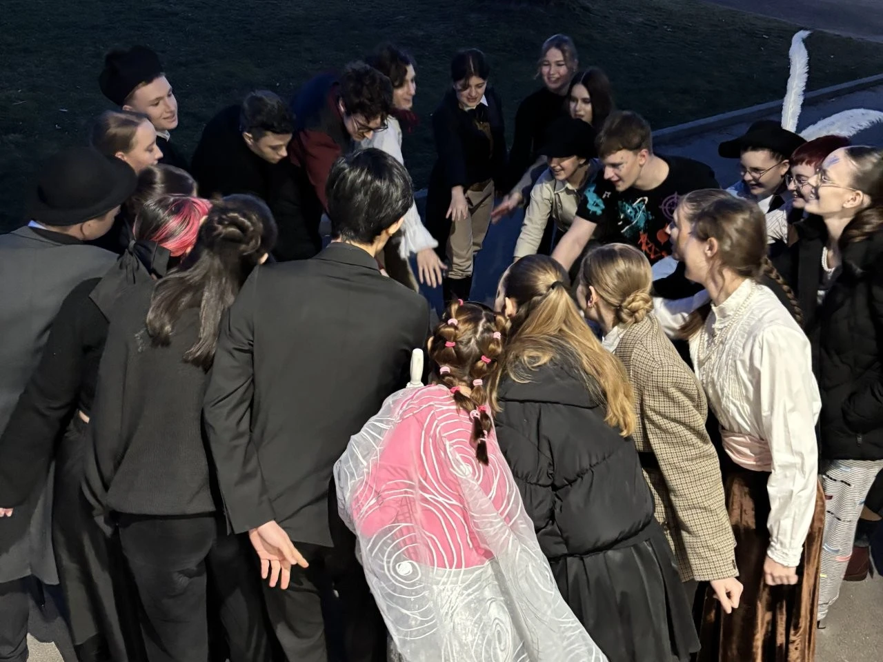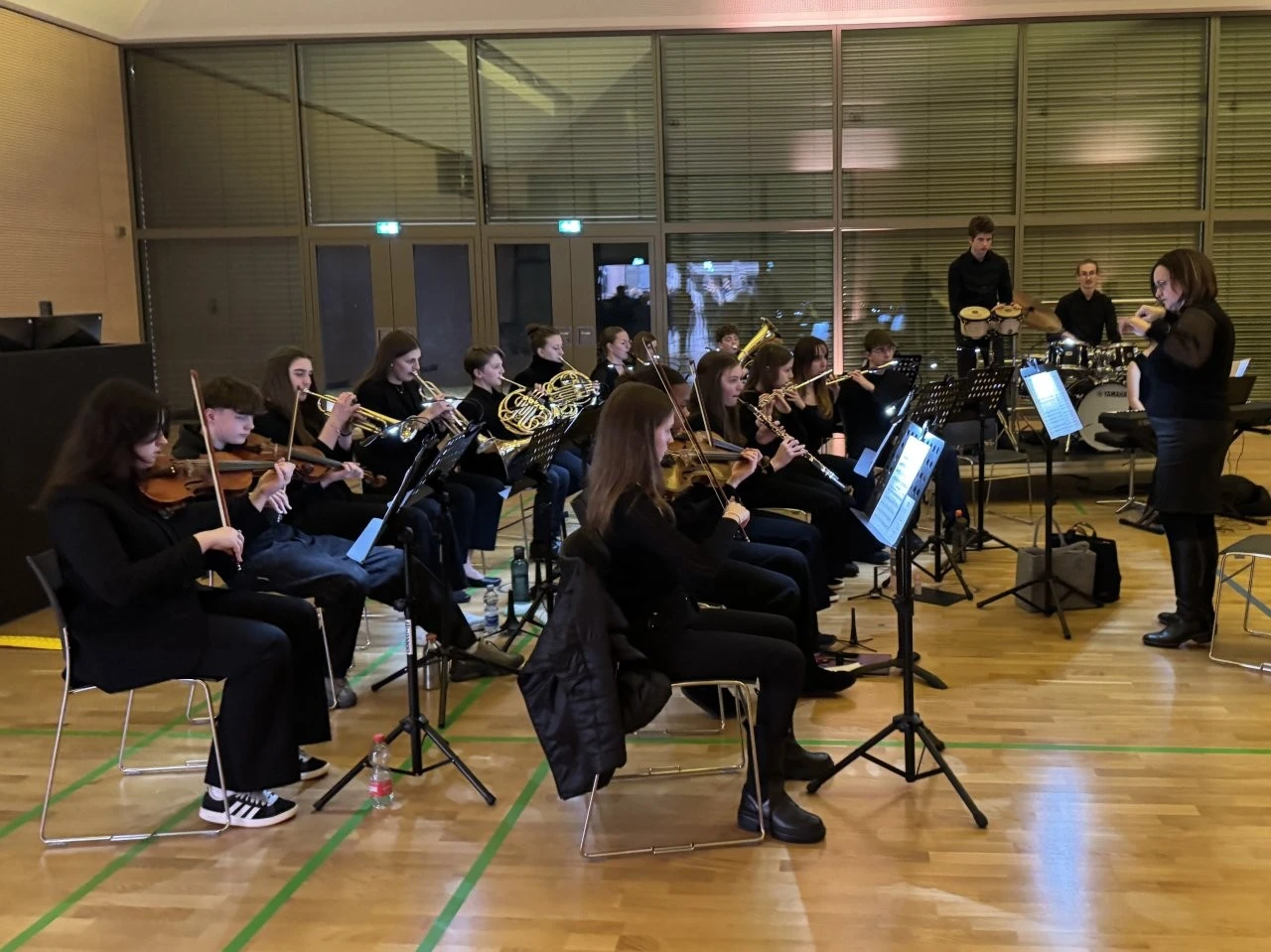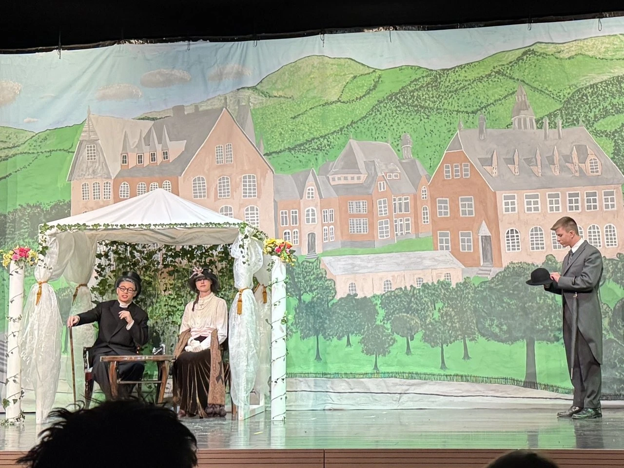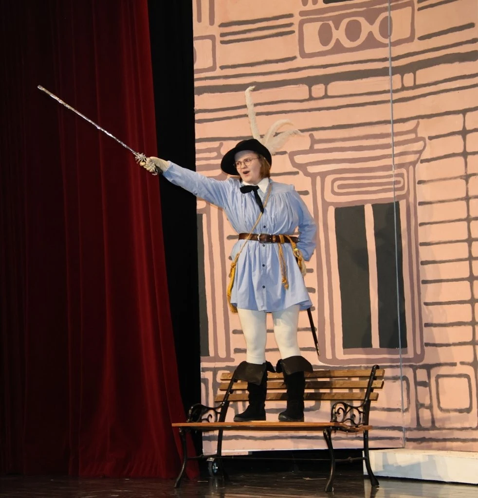 Der erste Quantensprung katapultierte die Zeitreisenden Clara (Rosa Straub), Jenna (Medea Wäldele), Max (Janik Wang), Anni (Charlotte Schmid) und Toni (Sophie Jarosch) ausgerechnet vor eine Schule in Konstanz. Doch, oh Schreck, just in diesem Moment wurde ein junger Bursche mit einem Heckerhut auf dem Kopf und einem Säbel in der Hand aus dem Gymnasium geworfen. „Ihr seid auch Revolutionäre! Schließt Euch mir an!“ rief der junge Revolutionär, fuchtelte mit seinem Säbel herum und outete sich als ein revolutionärer Hitzkopf, der nach der gescheiterten Revolution von 1848 in die Schweiz fliehen musste. Im faszinierenden Spiel entlang der Zeitlinie gelang es Adrian Keller auf faszinierende Weise, die Persönlichkeit Franz Xaver Lender und die Schulgeschichte so zu präsentieren, dass historische Fakten, humorvolle Elemente und ausdrucksstarkes Spiel der Akteure sich zu einem perfekten kulturellen Jubiläumsgeschenk formten. Daran hatte das Orchester des Musikprofils 9 (Leitung Ellen Krämer) einen klangschönen Anteil, denn die Zeitetappen wurden variantenreich mit jazzigem Sound, festlichem „Pomp and Circumstance“ und futuristischen Star-Wars-Melodien bereichert. Für die Zeitreise schuf die Bühnenbild-AG (Leiter Eberhard Schreiber) mit vielen jungen Handwerkern originelle Kulissen und großformatige Bilder. Dazu wurden die Reisenden von der Kostümbild-AG (Leiterin Tanja Esser) mit dem passenden modischen Schick der jeweiligen Zeit ausgestattet, während die Veranstaltungstechnik-AG (Leiter Bernhard Starck, Christian Vierling und Christian Wiedermann) für tolle Licht- und Ton-Effekte sorgte.