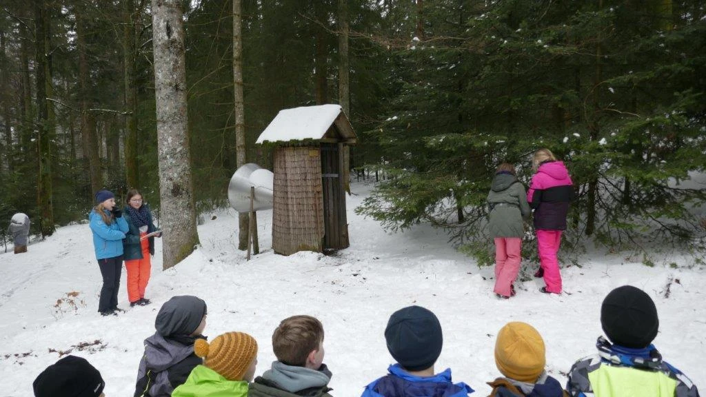 Früh am Morgen, genau genommen um 8:30 Uhr, startete der Bus der Klasse 5d in Begleitung von Frau Kreuz und Frau Großmann ab der Lender-Bushaltestelle Richtung Waldklassenzimmer, dieses befindet sich an Hundseck. Nach knapp einer halben Stunde im Bus und einem kleinen Fußmarsch erreichten wir das Waldklassenzimmer, wo auf uns auch schon Frau Schreier und Frau Wienk-Borgert warteten. Nachdem alle ihre Taschen in einer kleinen Hütte verräumt hatten, ging es auch schon los mit einer Vorstellungsrunde, bei der wir uns in einen Kreis stellten und jeder seinen Namen laut und deutlich dem Rest der Gruppe mitteilte.
