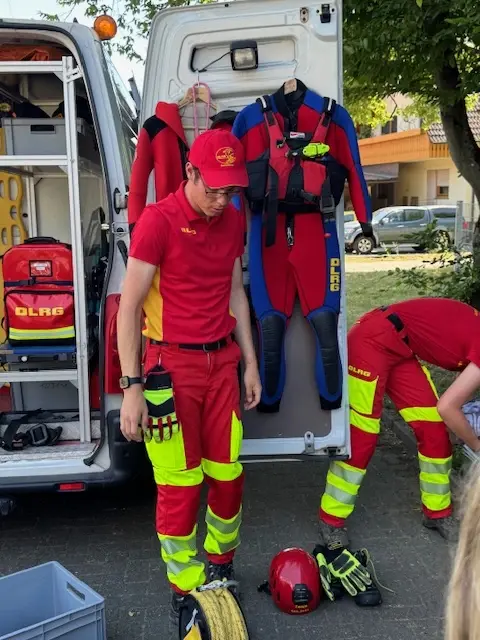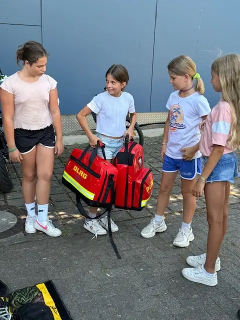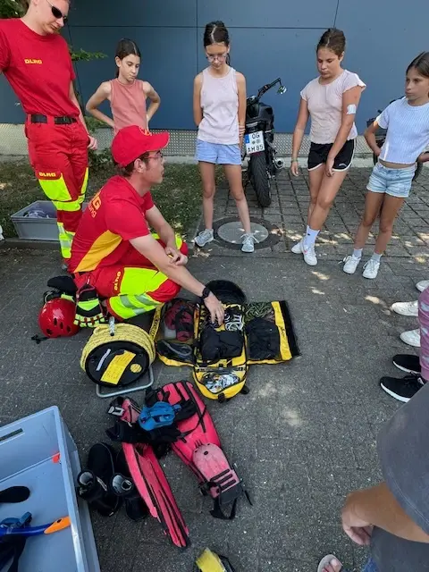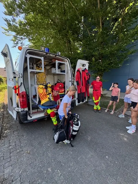 Die AG-Teilnehmer, die alle auf den Erwerb eines Schwimmabzeichens hinarbeiten, konnten die Ausrüstung im DLRG-Fahrzeug in Augenschein nehmen, z.B. die Taucherausrüstung, und erhielten viele Informationen zu den Einsätzen der DLRG.
