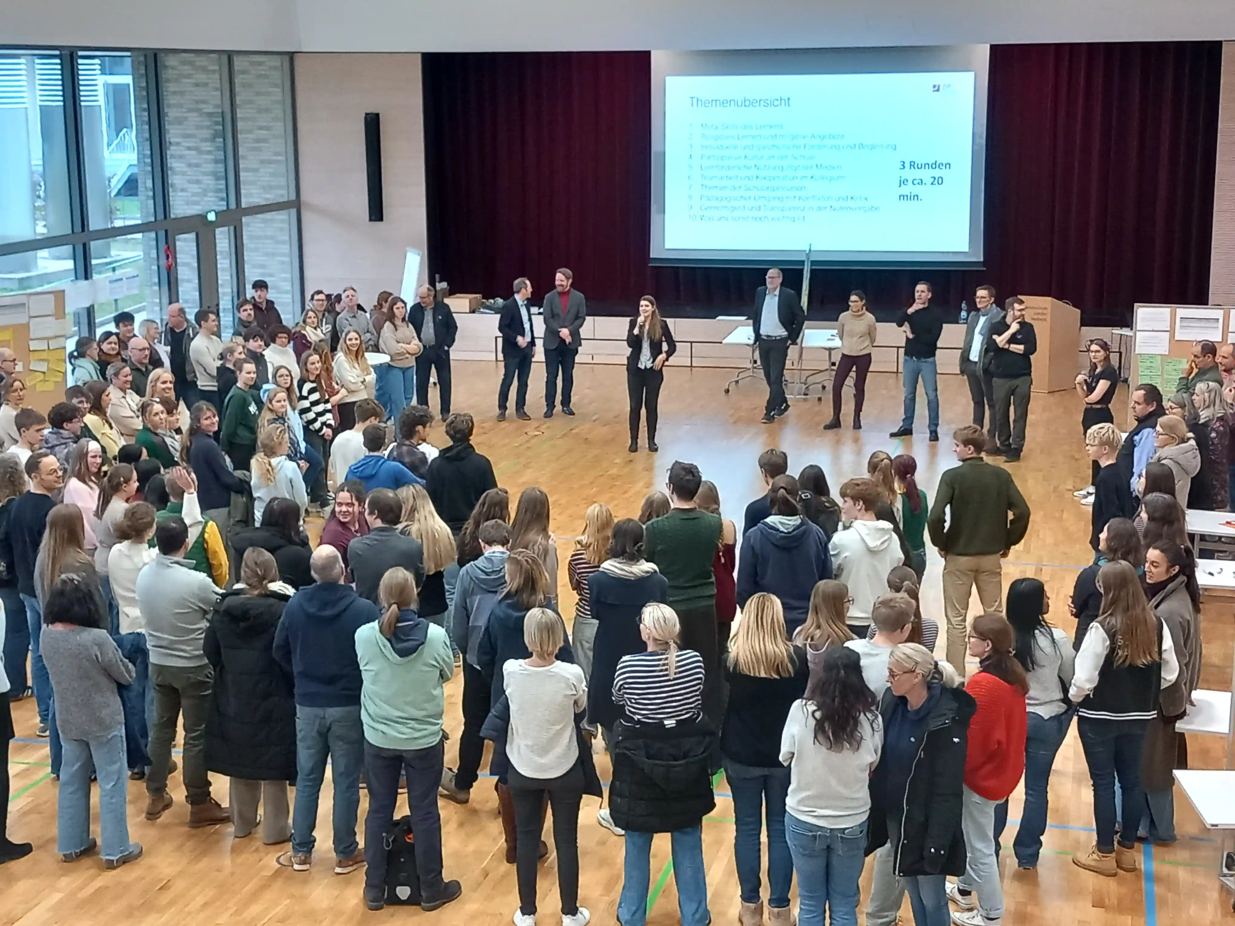 Über 1.000 Schüler, Lehrer und Eltern haben im vergangenen November an der Evaluation durch das Zentrum für Ignatianische Pädagogik teilgenommen und die Online-Fragebögen beantwortet. Im Januar wurden uns jetzt die Ergebnisse präsentiert. In getrennten Veranstaltungen wurden Schüler, Lehrer und Eltern über die Ergebnisse informiert. Soviel sei schon einmal gesagt: Die Lender hat wirklich gut abgeschlossen. Die Zufriedenheitswerte waren überdurchschnittlich hoch. Dennoch gibt es natürlich auch Bereiche, die noch verbesserungswürdig sind. In einer gemeinsamen Dialogveranstaltung wurde über genau diese beraten, um Schlussfolgerungen für die weitere Schulentwicklung zu ziehen. Lebhaft wurde an den zehn Ständen diskutiert. Themen waren unter anderem gerechte Noten, Schulorganisation, Meta-Skills des Lernens oder auch digitales Lernen.