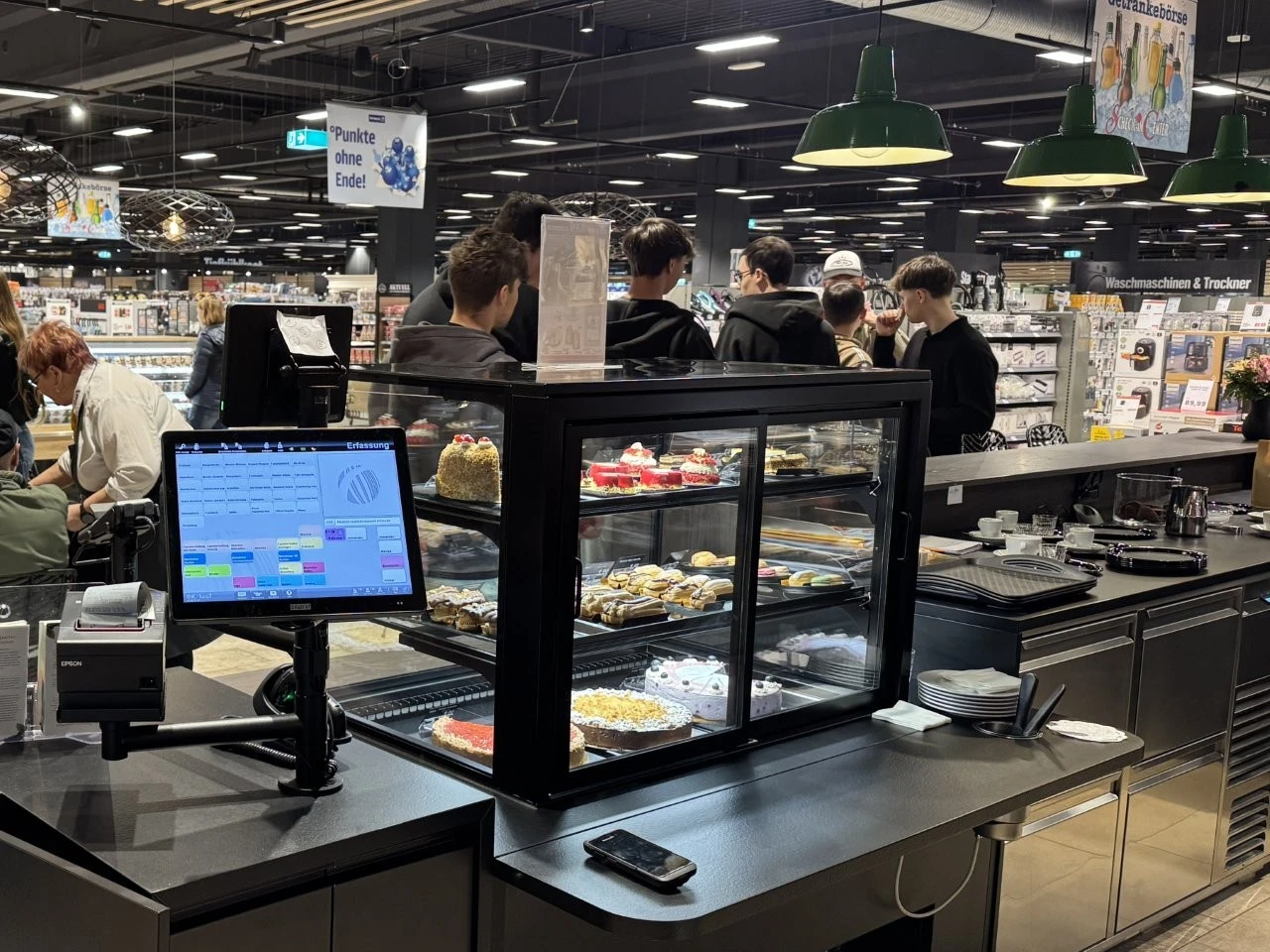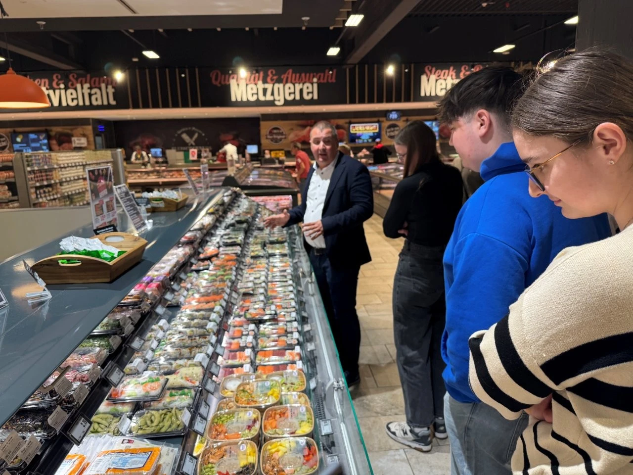 Nach der Präsentation ging es dann für die Schüler in zwei Gruppen, begleitet von der Geschäftsleitung unter Christoph Scheck-Berger und dem Marktleiter Georg Zieger, zu einem Rundgang. Dabei bekamen die Schüler einen Überblick der riesigen Verkaufsfläche, sowie den Lagerräumen hinter den Kulissen. Besonders für die Wirtschaftsklassen ist das Thema Lagerhaltung von großer Bedeutung. Das umfangreiche Angebot an Lebensmitteln im neuen Scheck-in Center beinhaltet nicht nur durch Drogerie- und Kosmetikartikel, sondern auch ein breites Sortiment an Haushaltswaren, Elektroartikeln, Zeitschriften und Kleidung. Highlights waren zudem die Espresso Bar mit der Röstmaschine und die Weinkammer, mit einer exklusiven Auswahl an alten Jahrgängen. Am Ende kamen die Schüler noch einmal zusammen und erhielten als Präsent einen Kuchen der eigenen Manufaktur.
