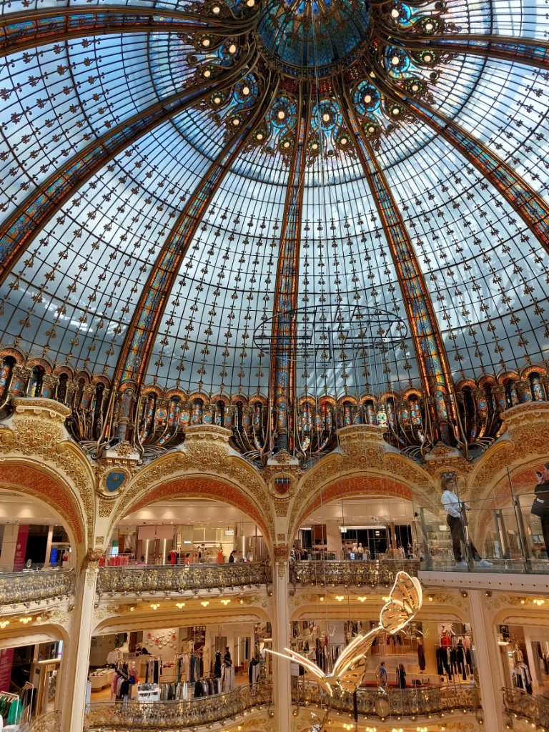 … haben wir den Tag damit begonnen, dass wir mit der U-Bahn nach Châtelet gefahren sind, bevor wir die Galeries Lafayette besucht haben, ein großes Luxusgeschäft mit einer Glaskuppel und hängenden Schmetterlingen. Danach sind wir am Louvre vorbeigekommen, ohne hineinzugehen, und haben eine kleine Pause auf den Tuilerien gemacht, bevor wir unseren Spaziergang zur Place de la Concorde fortgesetzt haben.