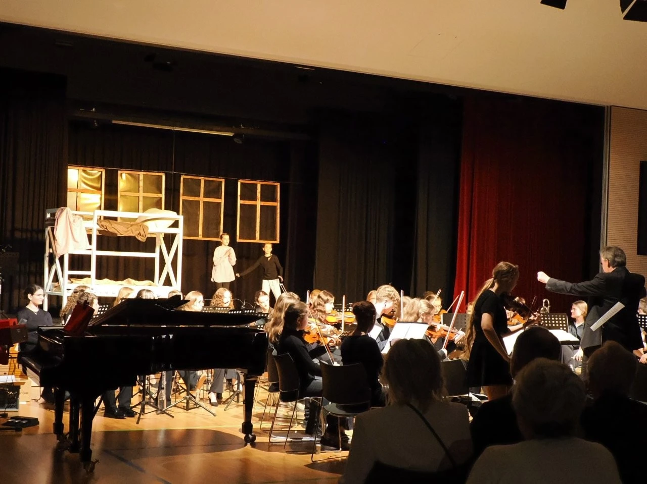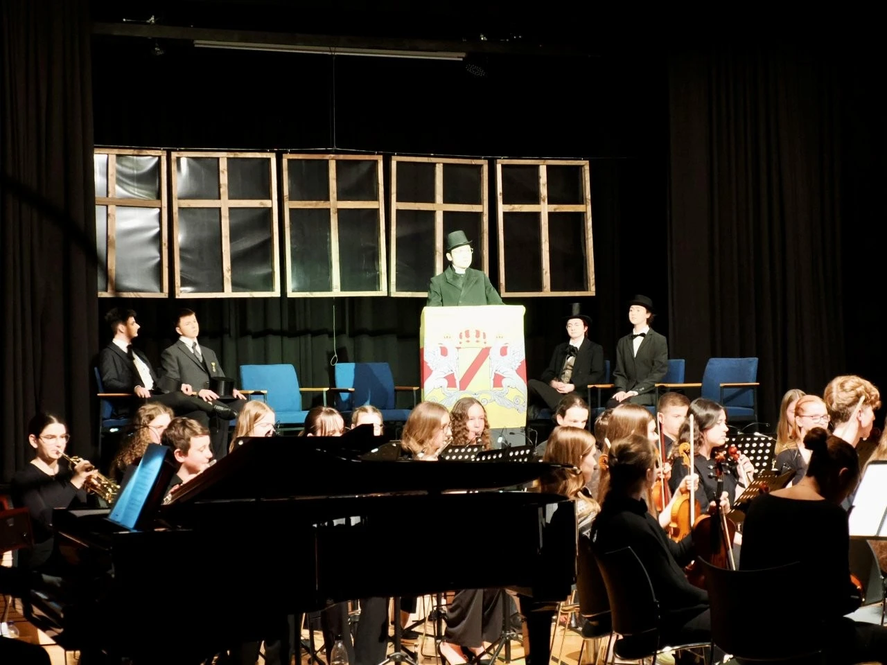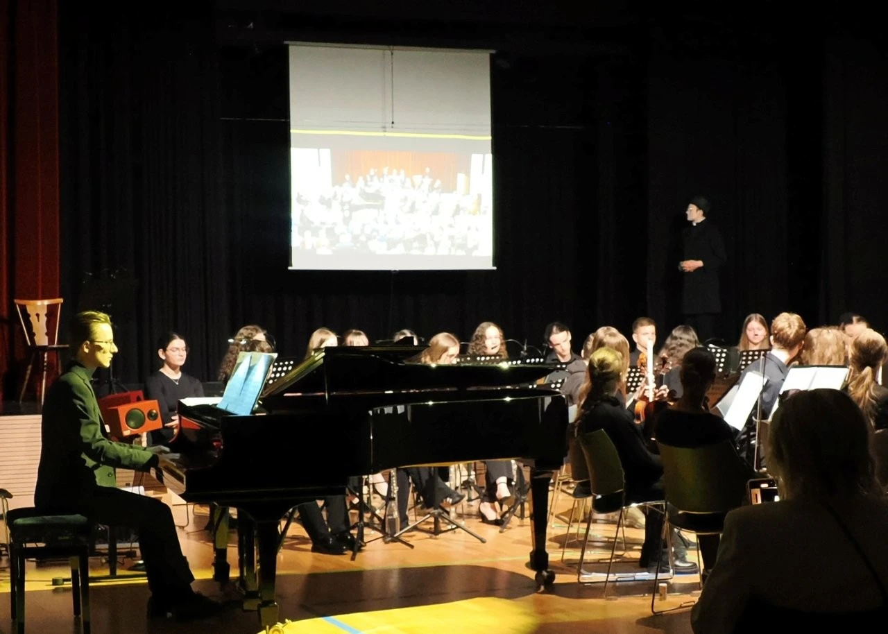 „Du liebst Musik, spielst ein Instrument und kannst neue Ideen entwickeln, um Musik lebendig auf die Bühne zu bringen?“ Die Schülerinnen Felia Conrad, Rahel Herrlich, Fanny Krämer und  Johanna Münchenberg nahmen diese Einladung des Deutsche Jugendorchesterpreises von „Jeunesses Musicales“ an, bildeten mit Musiklehrer Ulrich Noss eine Orga-Team und starteten ein einzigartiges Projekt, das über acht Monate hinweg neben dem Unterricht lief. Die Vorgabe des Wettbewerbes lauteten, von der Idee bis zur Aufführung schlichtweg alles selbst auf die Beine zu stellen, sich erfahrene Partner an die Seite zu stellen und Sinfonieorchester, Jugendchor, Schauspieler, Zeitzeugen sowie Arbeitsgemeinschaften für das Bühnenbild, die Kostüme und die Veranstaltungstechnik zu motivieren und einzubinden.
