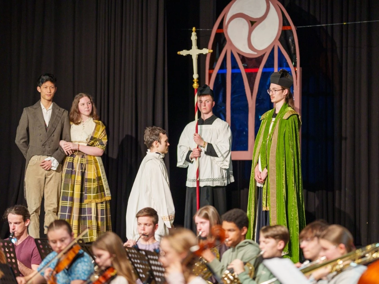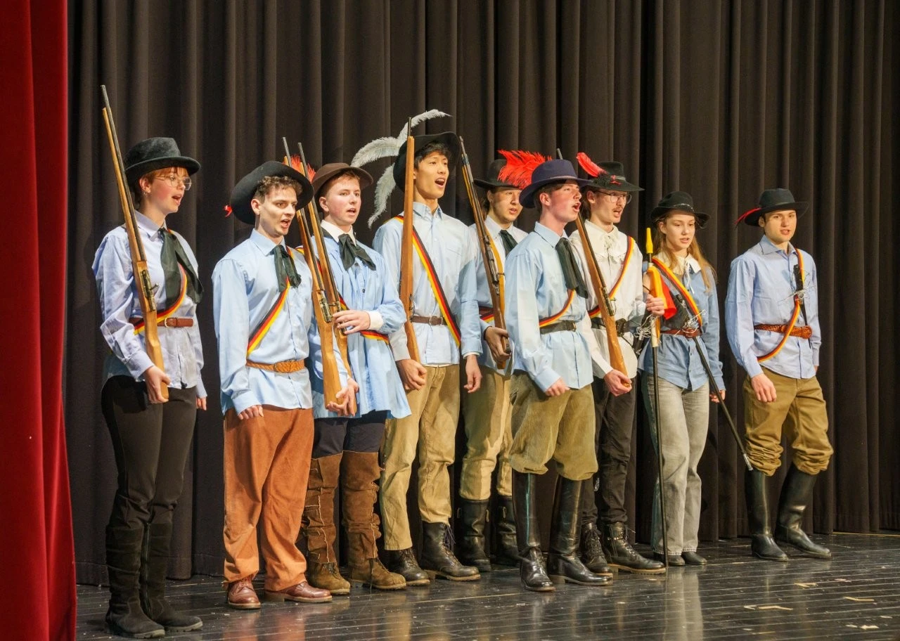Freiheit, Gleichheit, Gerechtigkeit! Die Rufe der jungen Lender-Revolutionäre aus den Reihen des Orchesters klangen vor dem Hintergrund aktueller Konflikte wie die beste Botschaft der Welt, als es bei einem einmaligen Projekt um Franz Xaver Lender und „Die Würde des Menschen“ ging. Denn die war damals zur Zeit des jungen Lender um 1848 genauso bedroht wie sie heute in vielen Ländern ist, so dass diese für den Deutschen Jugendorchester-Preis nominierte Aufführung inhaltlich, musikalisch und szenisch auch ein Plädoyer für die Würde des Menschen in all ihren Facetten war. Denn „Am Anfang der Weisheit steht die Ehrfurcht vor Gott und vor der Würde jedes Menschen“, betonte der frühere Internatsrektor Gerhard Brock beim Theaterspiel und ergänzte das Leitwort Lenders. Denn der Respekt vor der Würde jedes Menschen ist ein bleibender Auftrag seit 1875 über Generationen hinweg, was sich wie ein „roter Faden“ durch die famose Aufführung des von Schülern eigenständig entwickelten Projektes mit einer originellen und variationsreichen Musik- und Zeitreise durch 150 Jahre Lender-Geschichte zog.