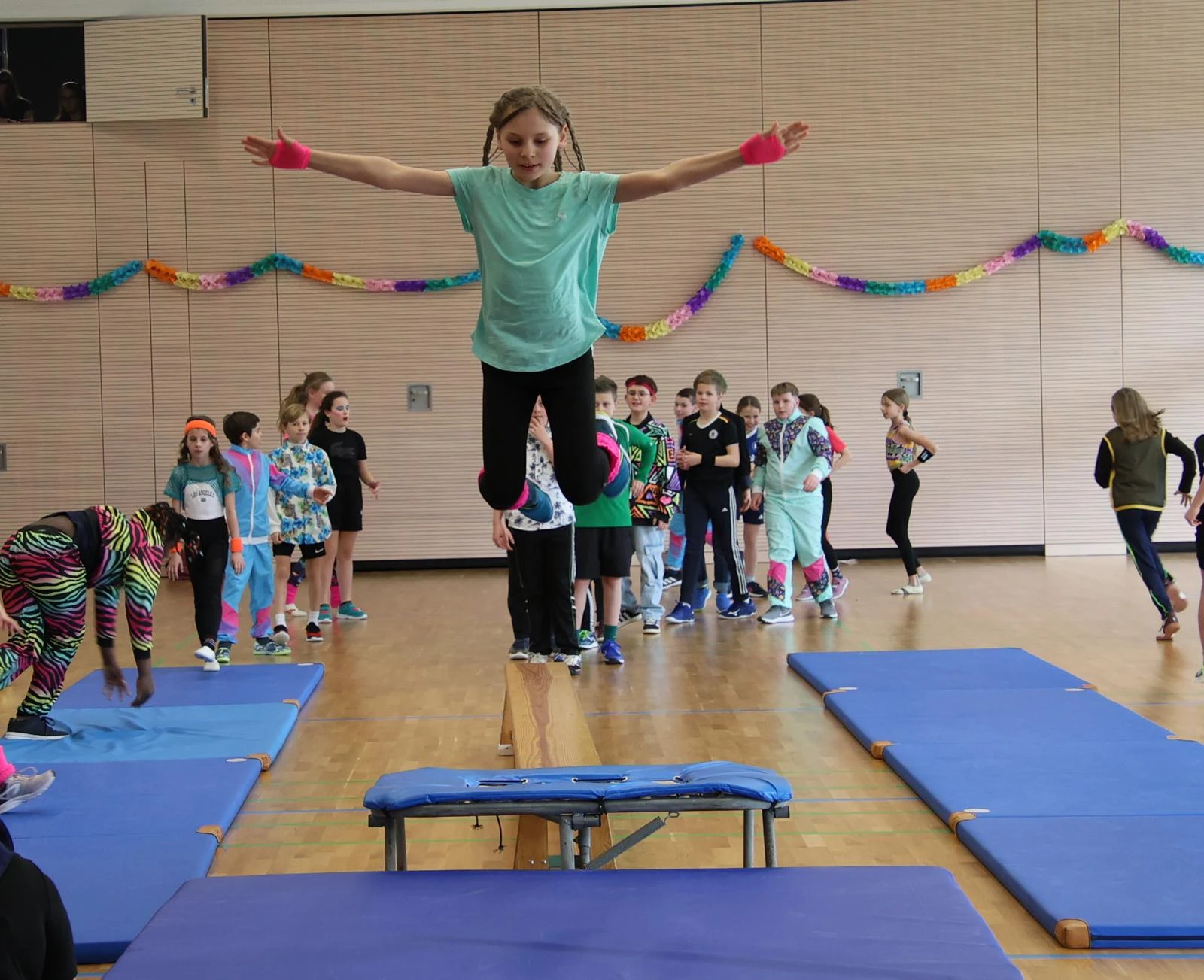 Darüber hinaus wurde ein tolles Programm abgeliefert (Moderation Rina de la Paz) mit einem selbst komponierten Lied (Tobias Götz), Stimmungsrunden sowie abwechslungsreichen Auftritten der einzelnen Klassen, die ihre Tänze, Sketche und Akrobatiknummern zum Besten gaben.