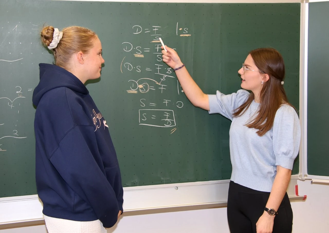 Die Neuntklässlerin wurde gut versetzt, doch Mathematik und Physik seien nicht gerade ihre Lieblingsfächer und nun möchte sie das wieder aufholen, was sie im letzten Schuljahr versäumte. „Ich habe schon aufgepasst, aber manches halt nicht verstanden“, meinte Lotta. Dies klappt nun im Einzelunterricht deutlich besser, die Tipps zur Beachtung der fehleranfälligen Kehrbrüche wurden gut vermittelt und die Schülerin war sichtlich zufrieden. „Es ist gut, für Mathematik und Physik etwas Handwerkszeug zu haben, damit nicht immer im Internet nach Lösungen gesucht werden muss“, so Sandrine Auer, die in wenigen Tagen in die letzte Kursstufe hin zum Abitur 2026 startet. Dazu werden in den Naturwissenschaften andere Formeln benötigt, die allerdings auf besagtem Grundwissen und „Handwerkszeug“ aufbauen.
