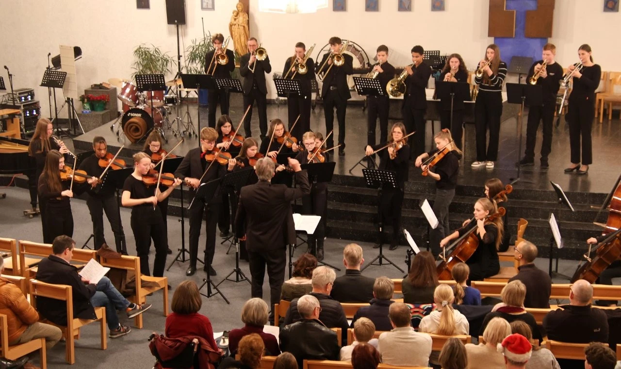 Im Stile der venezianische Mehrchörigkeit des 16. Jahrhunderts eröffnete ein Blechbläserensemble (Leitung Jürgen Bruder) das Konzert von der Empore aus, wobei mit der achtstimmigen „Canzon Septimi Toni No 2“ von Giovanni Gabriele das kunstvolle Wechselsiel wunderbar zum Klingen kam. Die Streicherklasse 6 (Leitung Marylène Lung und Stephan Lung) erfreute mit einer schönen Filmmusik aus „Les Choristes“ und ließ mit „Hört der Enge helle Lieder“ Weihnachtsstimmung aufkommen, während das Streichervororchester (Leitung Katharina Fehler) mit dem Musical „Beauty and the Beast“ und dem Ballett-Walzer „Dornröschen“ von Tschaikowsky viel Freude bereitete.